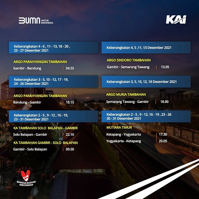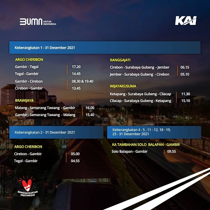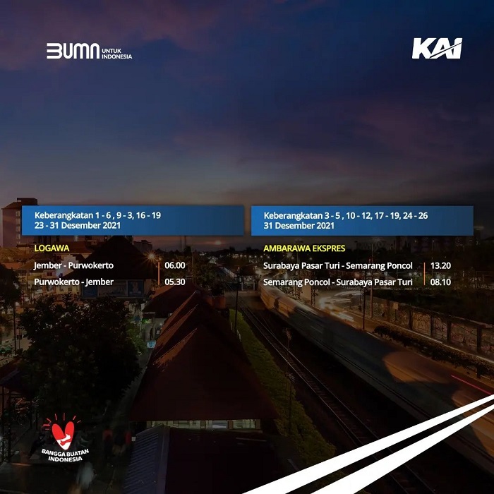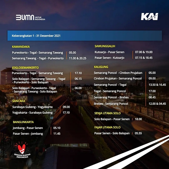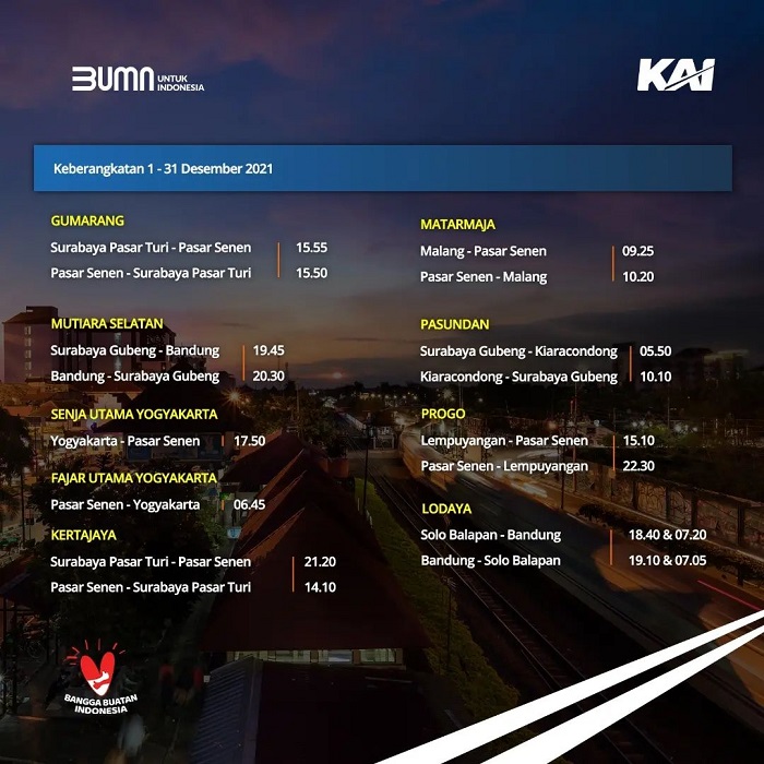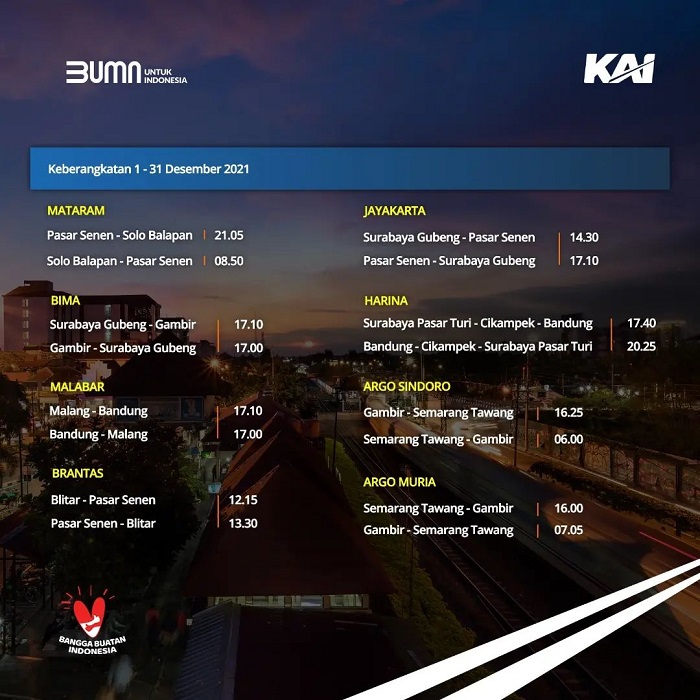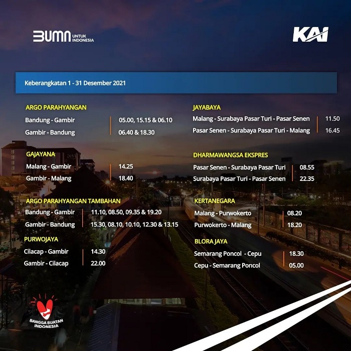 Dilansir dari akun Instagram resmi @kai121_, Minggu (5/12/2021), berikut jadwal perjalanan KA Jarak Jauh selama Desember 2021.