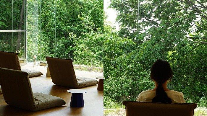 Di ruangan kafe yang tenang, pelanggan bisa duduk santai menghadap ke rimbunnya hutan Seoul.
