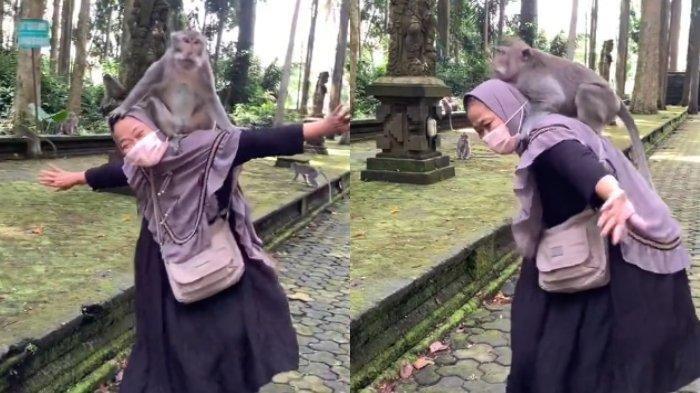 Aksi ini terjadi saat seorang ibu tengah berfoto dan tiba-tiba ada monyet yang berusaha naik ke badannya.
