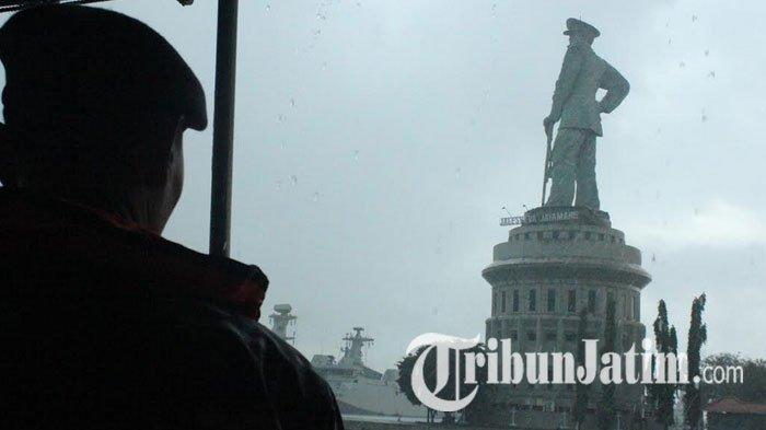 Monumen Jalesveva Jayamahe dibangun pada 1990, di mana menggambarkan perwira angkatan laut yang memegang pedang kehormatan.