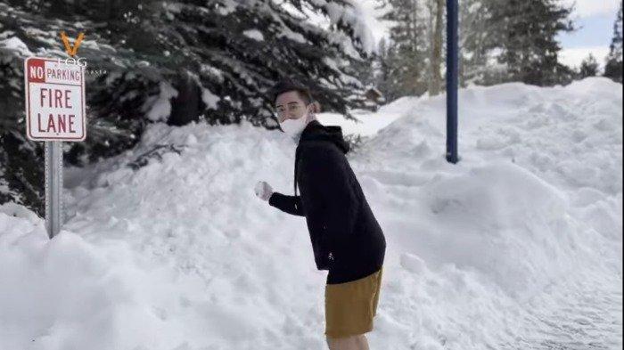 Sembari bertelanjang dada, Verrellpun bermain salju dengan amat berani.