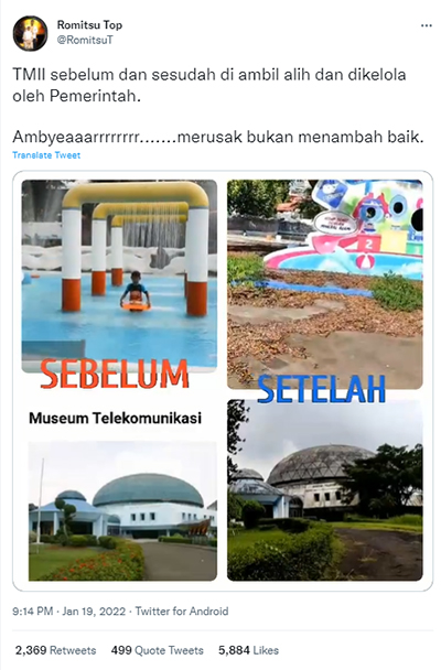 "TMII sebelum dan sesudah diambil alih dan dikelola oleh pemerintah. Ambyeaaarrrrrrrr.......merusak bukan menambah baik," cuit akun Twitter @RomitsuT pada Kamis (20/1/2022).
