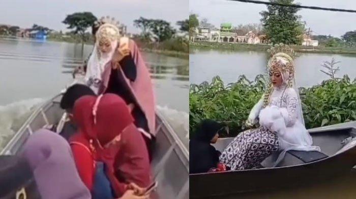 Dalam sebuah video viral di medsos, terlihat mempelai perempuan naik perahu lengkap dengan riasan wajah dan kebaya putih.