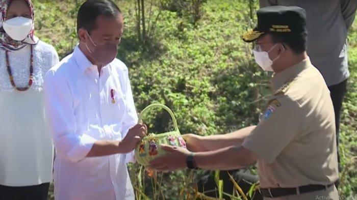 Dalam ritual Kendi Nusantara itu, Anies memberikan keranjang hijau berisi tanah dari Kampung Akuarium kepada Presiden Jokowi.