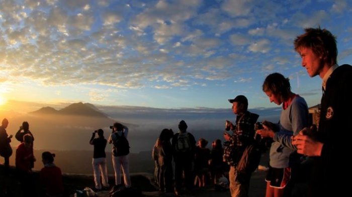 Wisatawan menikmati matahari terbit dari kawah I Gunung Batur di Kecamatan Kintamani, Bangli, Bali beberapa waktu lalu.