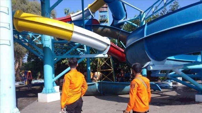 TRIBUNTRAVEL.COM - Seluncuran di wahana kolam renang Kenjeran Park (Kenpark) Surabaya, Jawa Timur, ambrol pada Sabtu (7/5/2022).