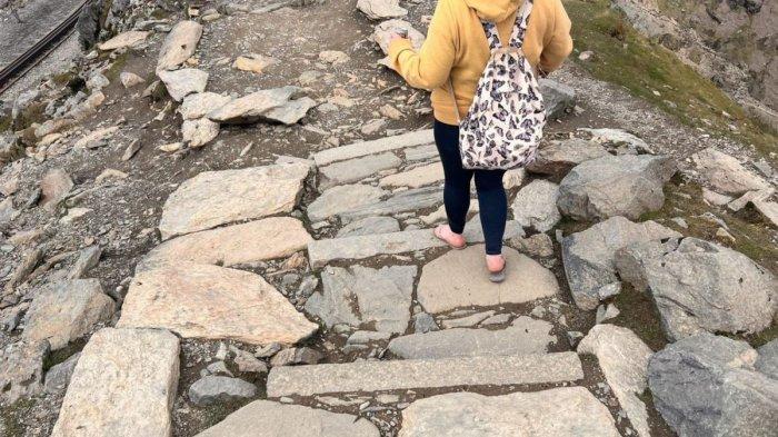 TRIBUNTRAVEL.COM - Seorang wanita terlihat menuruni gunung tertinggi di Wales hanya mengenakan sandal jepit di kakinya.