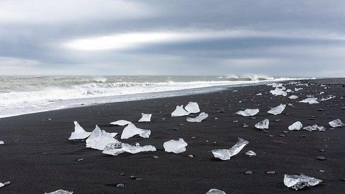 Bentuk es yang unik membuat pantai terlihat seperti ada berlian di sekelilingnya.