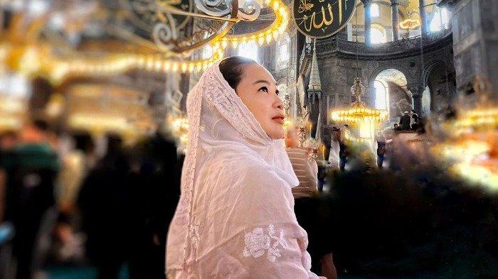 Ia tampak anggun dengan hijab berwarna pink dan berpose dengan latar belakang interior Hagia Sophia yang ikonik.