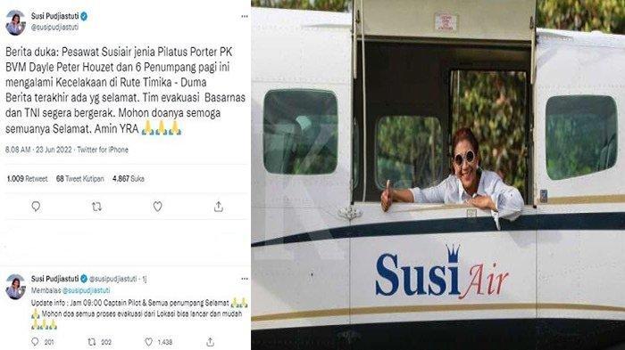 Kabar jatuhnya pesawat Susi Air ini juga diunggah mantan Menteri Kelautan dan Perikanan, Susi Pudjiastuti melalui akun Twitter pribadinya @susipudjiastuti.