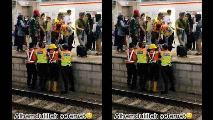 Setelah kereta melaju, ada beberapa petugas yang mengenakan pakaian berwarna oranye menolong perempuan yang terselip di pinggiran rel kereta.