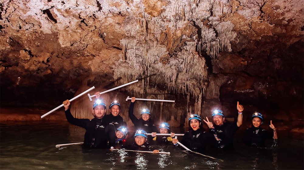Traveler dapat berenang melalui rute sekitar 1 kilometer yang penuh dengan stalaktit dan stalagmit yang indah.