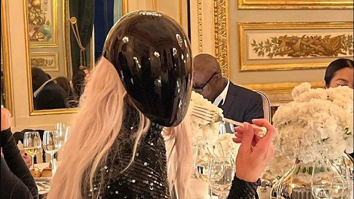 Bagaimana tidak, Kim Kardashian tampil dengan wajah yang tertutup topeng hitam mengkilap.