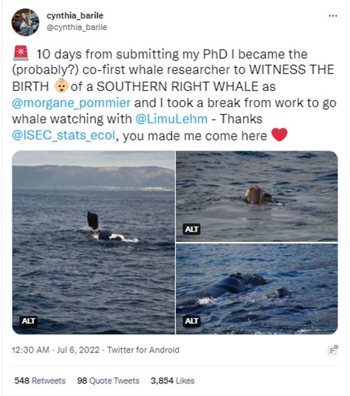 Saat berada di perairan, Cynthia melihat Paus Kanan Selatan di dekat permukaan dan kemudian ada dua.