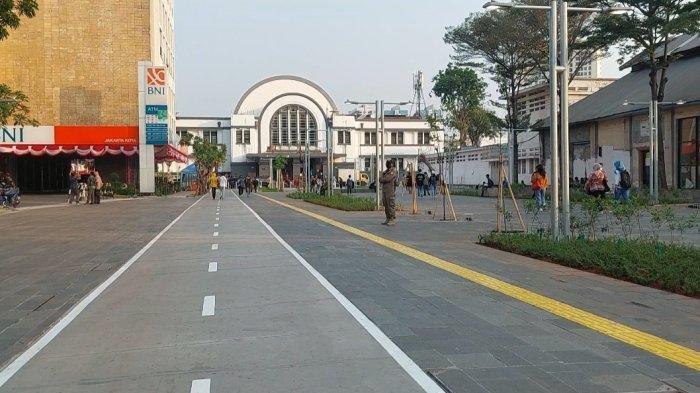 Pantauan TribunJakarta.com di lokasi Kamis (25/8/2022), jalur pedestrian di Jalan Lada depan Stasiun Jakarta Kota mengarah ke Taman Fatahillah, kini sudah bisa dilintasi oleh para pejalan kaki.