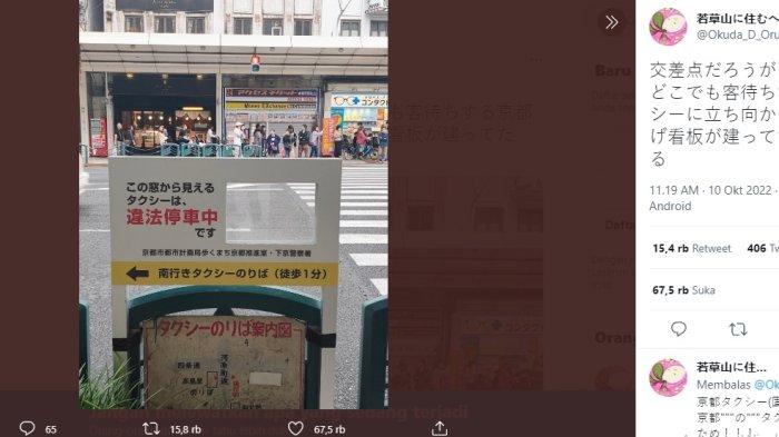 Seperti yang ditunjukkan dalam tweet dari pengguna Twitter Jepang @Okuda_D_Orugu , jendela tanda itu menghadap ke aspal jalan Shijo-dori di pusat kota Kyoto, dan teks di sebelahnya berbunyi: "Taksi yang bisa Anda lihat melalui jendela ini diparkir secara ilegal."