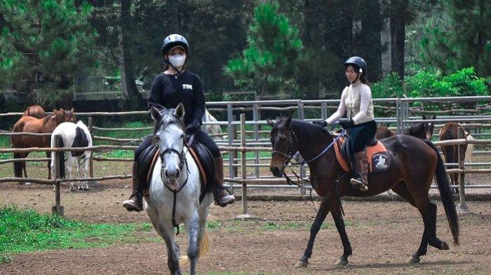 Tak hanya anak-anak, pengunjung dewasa juga bisa menjajal serunya berkuda di De Ranch Lembang.