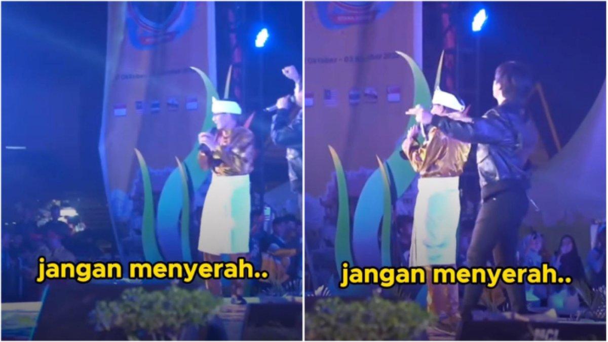 Mengenakan pakaian adat khas Melayu, Sandiaga Uno tampak menyanyi lagu Jangan Menyerah bersama grup band musik D'Masiv.