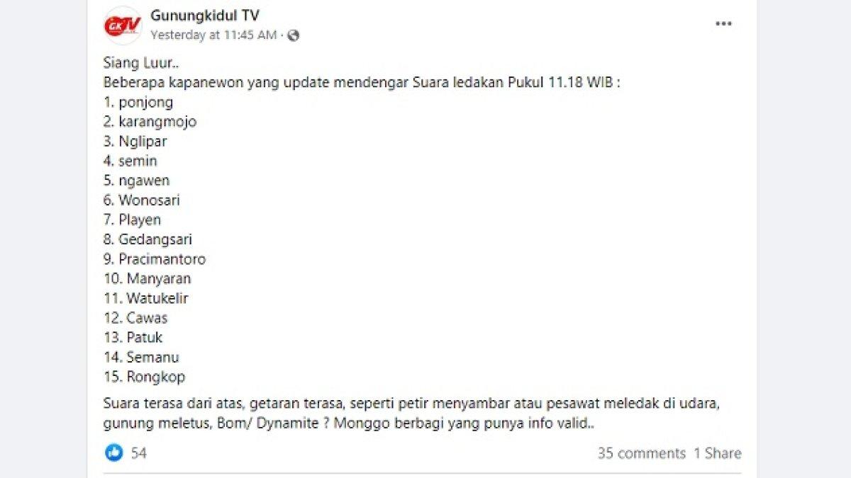Satu di antaranya yakni akun Facebook Gunungkidul TV, yang mengunggah informasi dentuman misterius pada Kamis (22/12/2022) kemarin.