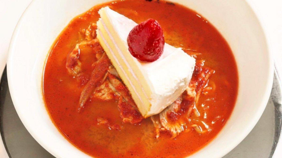 Nah, bulan ini, Franken mulai menjual hidangan aneh lainnya, miso ramen dengan sepotong strawberry shortcake yang direndam dalam kuah yang hangat.