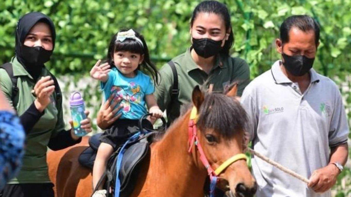 Ia menunggang kuda poni cokelat ditemani keeper dan penjaga selagi berjalan-jalan.