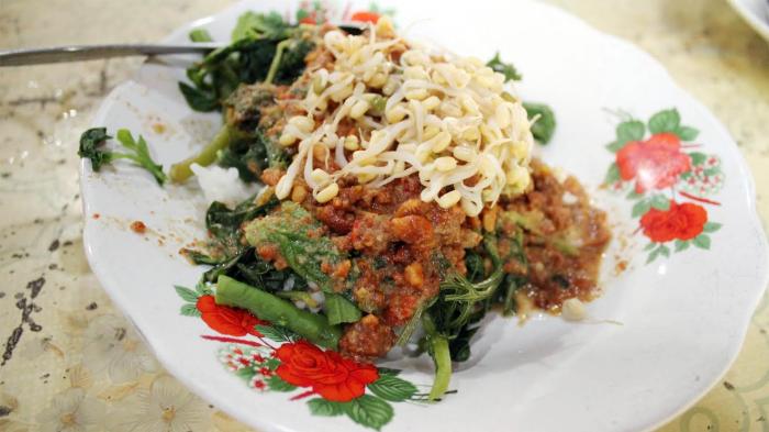 Aneka sayuran tersebut ditata di atas nasi kemudian disiram dengan sambal kacang yang khas.