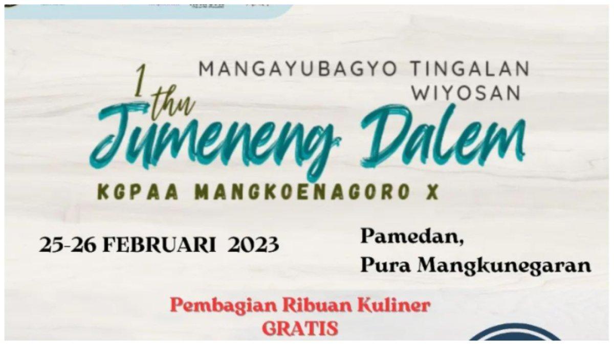 Dikutip dari @solocreativeculturecarnival_, Sabtu (25/2/2023), pesta rakyat Pura Mangkunegaran Solo itu diadakan pada 25-26 Februari 2023.