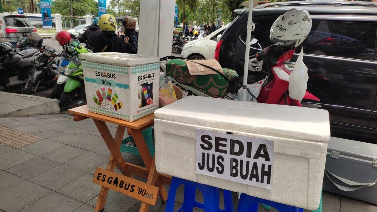 Terlihat di sana ada es potong, telur gulung, surabi Solo dan masih banyak lagi.