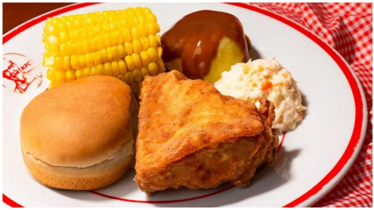 Menu klasik yang diberikan mulai dari OR chicken, dinner roll, jagung manis, coleslaw, mashed potato, dan saus gravy.