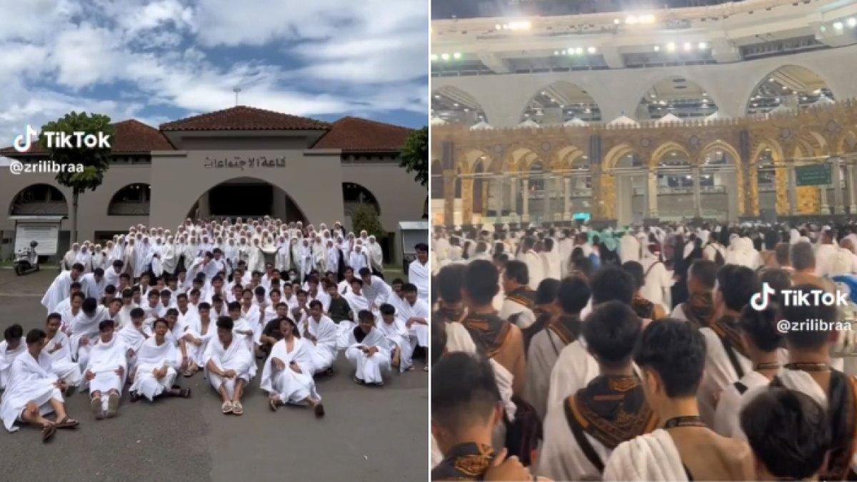 Lalu terlihat juga momen saat rombongan siswa-siswi SMA itu mengenakan pakaian ihram saat hendak memasuki Kota Mekkah.