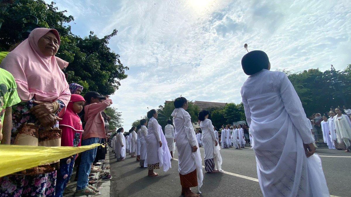 Terlihat ratusan penari yang mengenakan pakaian bernuansa putih mulai melakukan gerakan tarian.