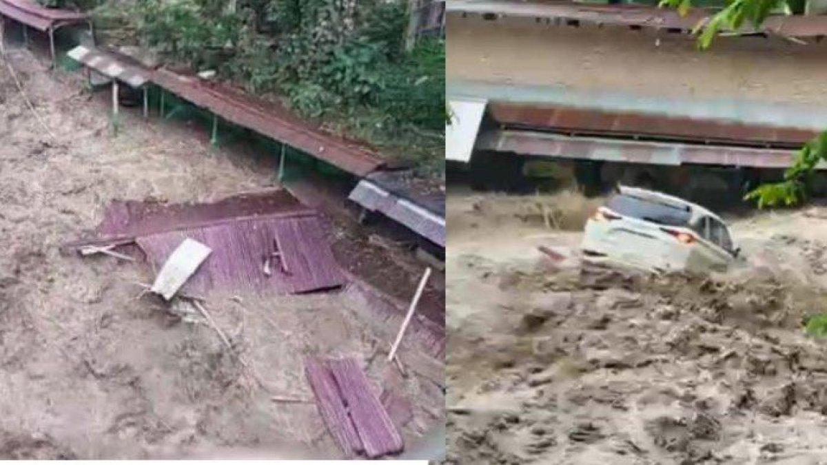 Belum diketahui apakah ada orang atau tidak di dalam mobil yang hanyut tersebut.