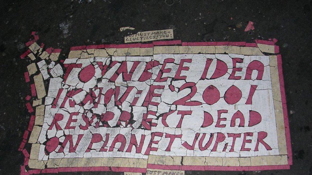 TRIBUNTRAVEL.COM - Sejak 1980-an, ubin mozaik berwarna-warni seukuran pelat telah muncul secara misterius di jalan-jalan kota, paling sering bertuliskan: "TOYNBEE IDEA IN KUBRICK'S 2001 RESURRECT DEAD ON PLANET JUPITER."