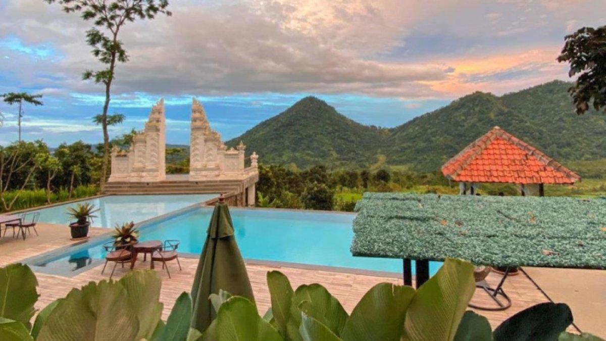 Berkunjung ke Mandapa Kirana kamu akan disuguhkan pemandangan pegunungan serta bangunan pura, infinity pool, air terjun serta area persawahan.