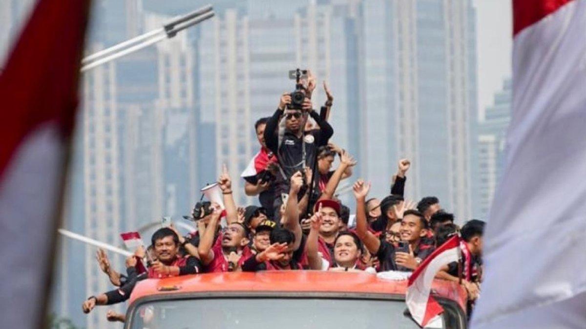 Erick Thohir hingga para pemain Timnas Indonesia U22 pun nangkring di atas bus untuk mengikuti arak-arakan.