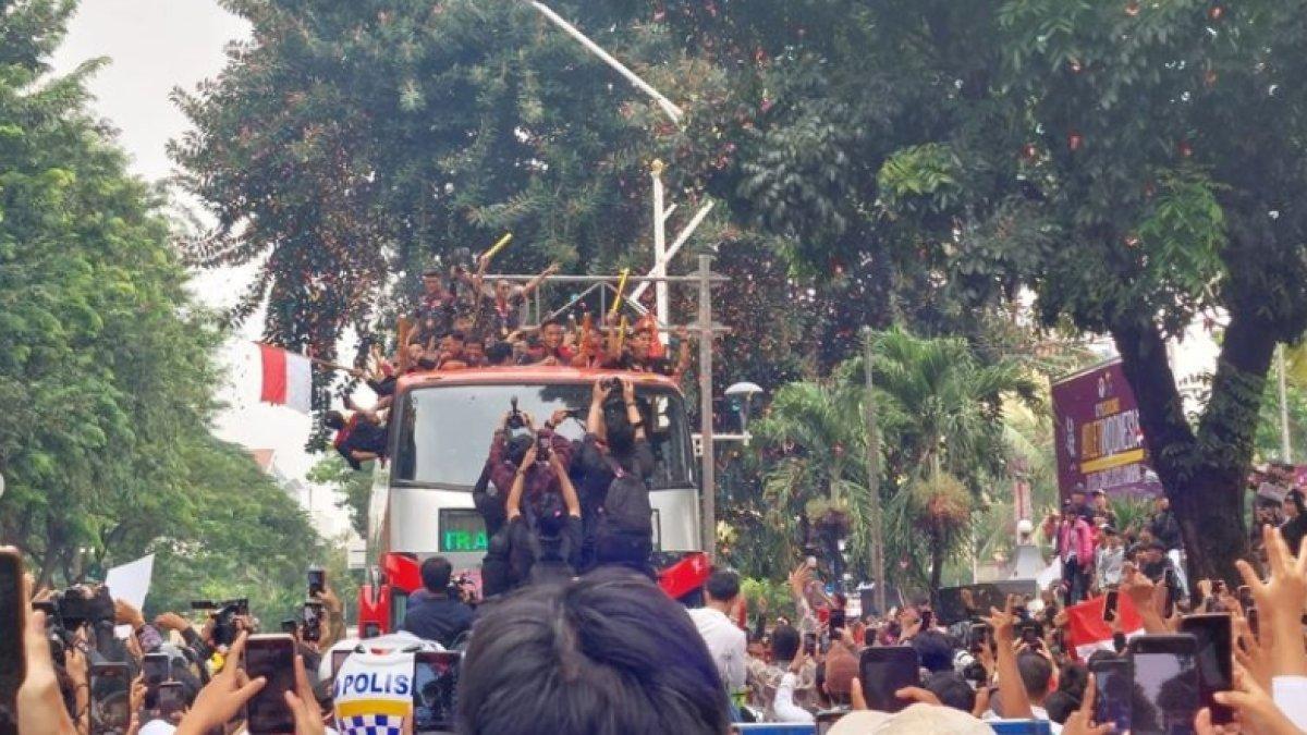 Pelatih Timnas U-22, Indra Sjafri, juga ikut dalam bus terbuka yang membawa rombongan pesepak bola itu. Seketika, jalan di sekitar Geloran Bung Karno, Jakarta Selatan, menjadi lautan manusia.