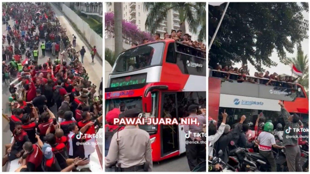 Tampak Erick Thohir, beserta rombongan pemain Timnas Indonesia menaiki bus tingkat Transjakarta dan disambut meriah oleh masyarakat.