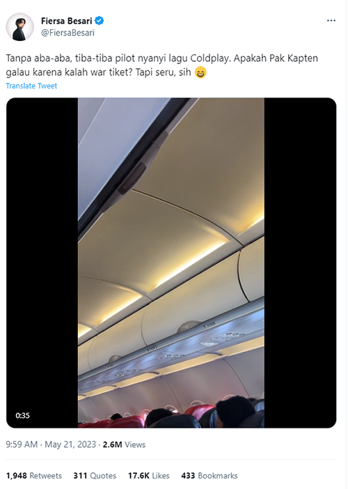 "Tanpa aba-aba, tiba-tiba pilot nyanyi lagu Coldplay. Apakah Pak Kapten galau karena kalah war tiket? Tapi seru, sih," keterangan dalam akun Twitter @FiersaBesari, Minggu (21/5/2023).