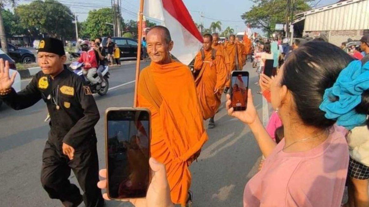 Dalam video tersebut terlihat puluhan biksu Thudong berjalan disambut ratusan warga.