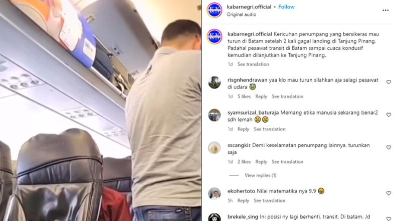 "Kericuhan penumpang yang bersikeras mau turun di Batam setelah 2 kali gagal landing di Tanjung Pinang. Padahal pesawat transit di Batam sampai cuaca kondusif kemudian dilanjutkan ke Tanjung Pinang," keterangan yang tertulis dalam video.