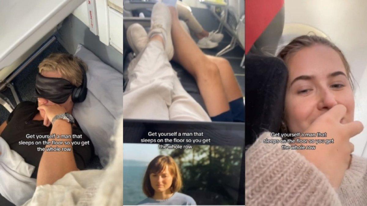 Dalam video itu ia menuliskan 'Dapatkan seorang pria yang rela tidur di lantai (pesawat) sehingga kamu bisa mendapatkan seluruh baris kursi (pesawat)'.