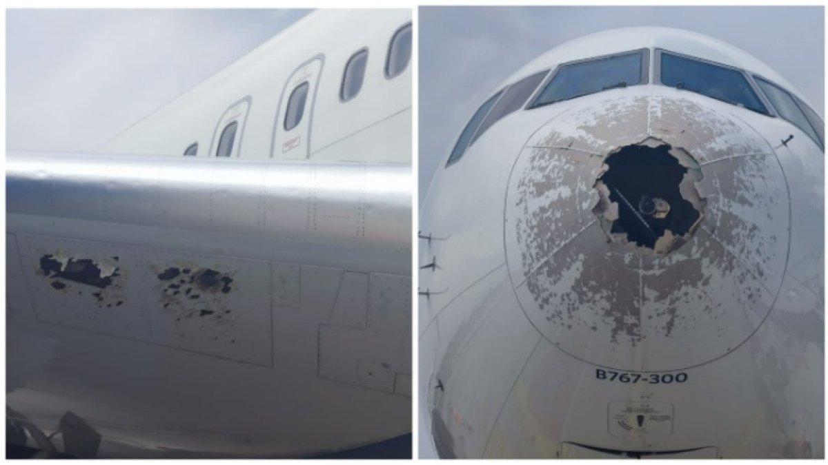 Hidung dan sayap pesawat bolong seukuran bola tenis karena dihantam badai es.
