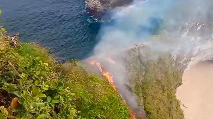Dalam video yang beredar, nampak kebakaran di Pantai Kelingking tepatnya di bawah tebing.