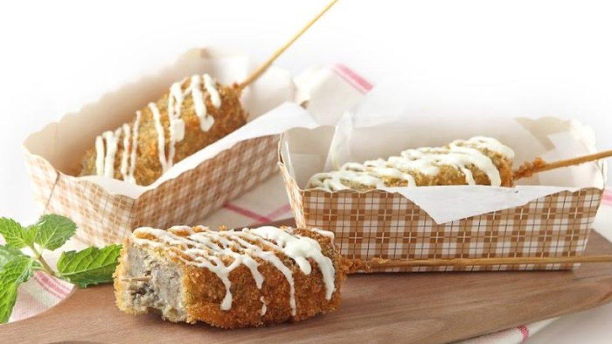 - Kukus di dalam kukusan yang sudah dipanaskan di atas api sedang, 15 menit hingga matang. Dinginkan. Potong 6x2 cm. Celupkan ke dalam bahan pencelup. Gulingkan di atas tepung panir kasar. Tusuk dengan tusuk sate.