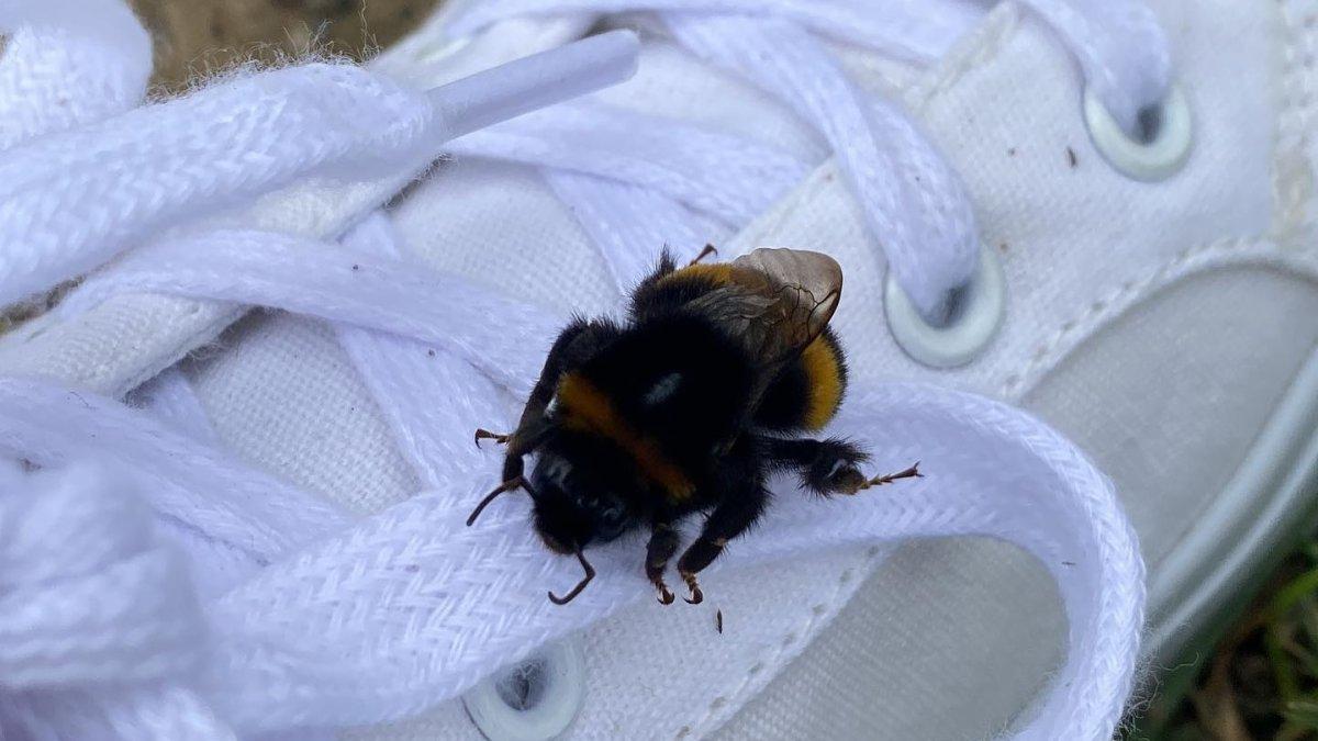 Dalam video tersebut, lebah terlihat memanjat ke atas sepatu seorang wanita saat berjalan-jalan.