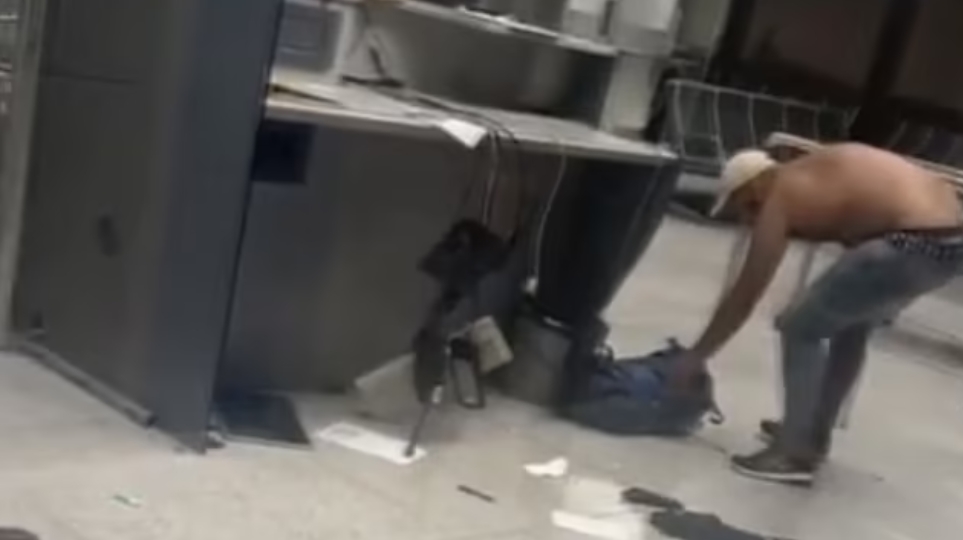 Pria agresif itu menanggalkan kausnya karena marah sebelum mulai melemparkan perabotan ke arah staf bandara.
