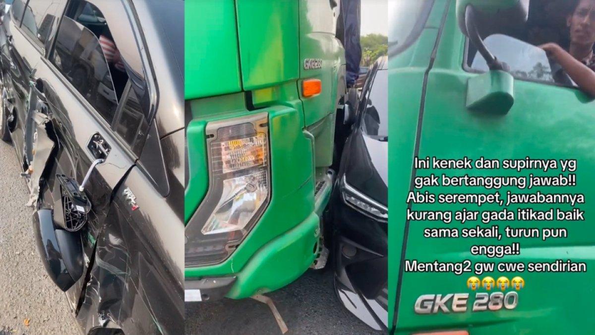 TRIBUNTRAVEL.COM - Video viral memperlihatkan seorang wanita yang teriak histeris lantaran mobilnya ditabrak truk.