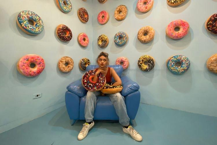 Di sana kamu akan menemukan sebuah sofa dengan donut besar menempel di dinding belakangnya.