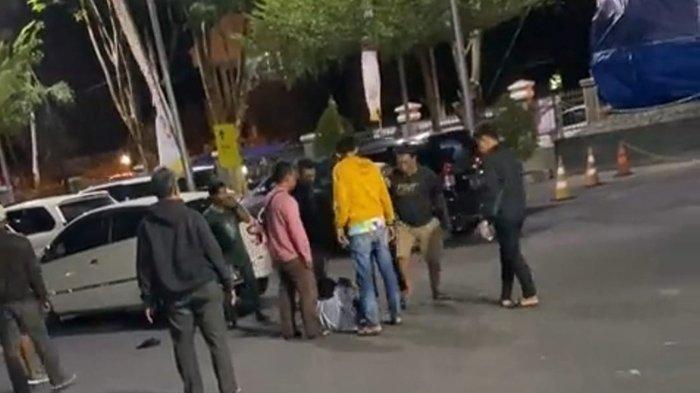 Terekam seorang pria paruh baya tersungkur dan dikerubungi beberapa pria.