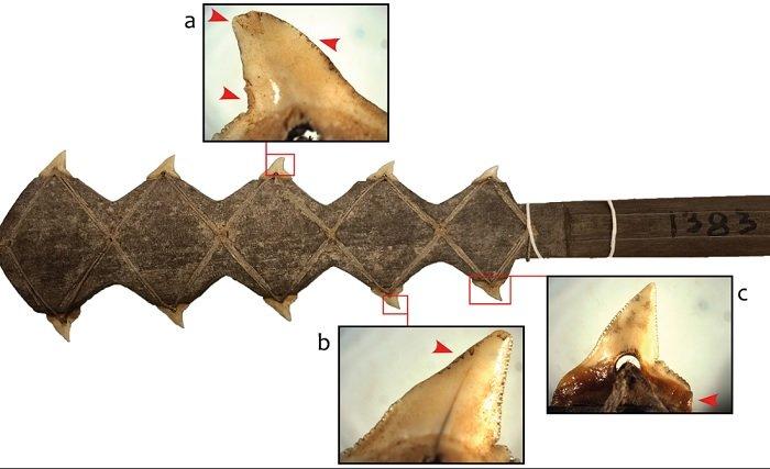 Penulis penelitian melaporkan bahwa "pisau tempur" yang ditemukan di Queensland utara memiliki bilah yang terbuat dari 15 gigi hiu.